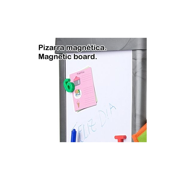 Есть даже магнитная доска для магнитов на холодильник.Любой маме захочется прикоснуться к этой кухне, потому что в комплекте:сковорода,кастрюля,чашки,столовые приборы и многое другое.Но на этой кухне хозяева- маленькие дети.