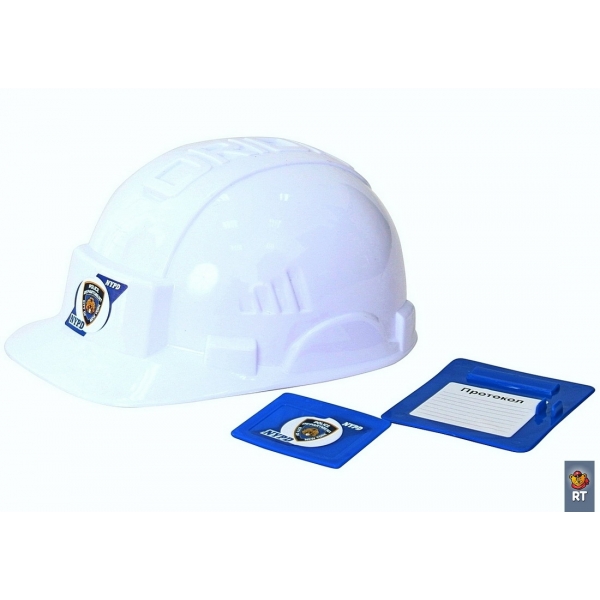 - В комплекте также предусмотрен защитный шлем для ребенка, напоминающий головной убор стража порядка, а также жетон и протокол для заполнения.