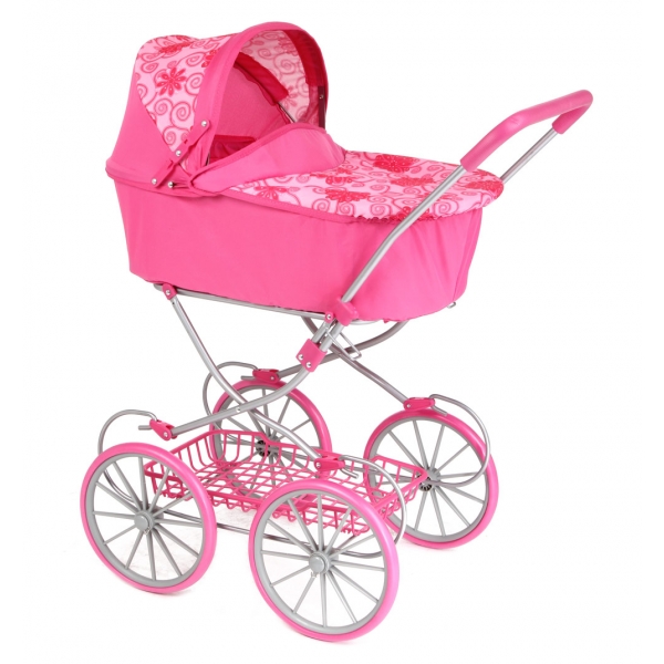 Одна из самых высокий моделей. Коляска выполнена в классическом стиле, с большой корзиной-люлькой, капюшоном, корзиной для мелких кукольных вещей, как у настоящей коляски.