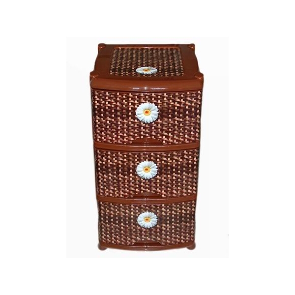 Имеет 3 глубоких ящика и выполнен под плетенку.
