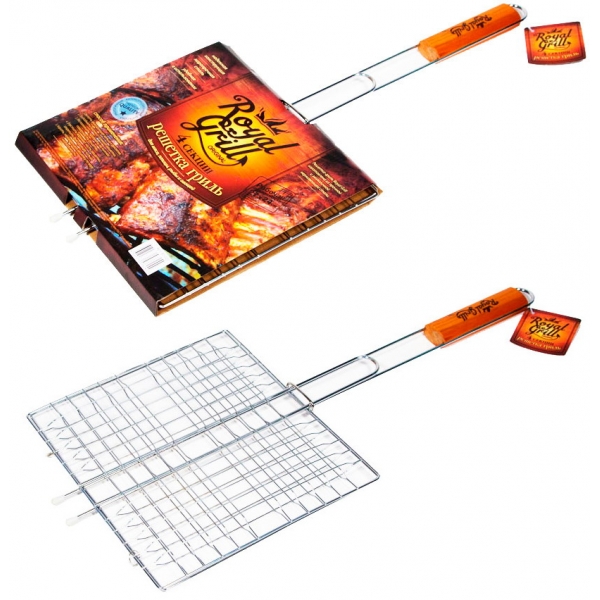 Решетка-гриль универсальная 4 секции 27х24см RoyalGrill изготовлена из высококачественной стали. На решетке удобно размещать стейки, ребрышки, гамбургеры, сосиски, рыбу, овощи. Блюда получаются сочными, ароматными, с аппетитной специфической корочкой. Рукоятка изделия оснащена деревянной вставкой и фиксирующей скобой, которая зажимает створки решетки.