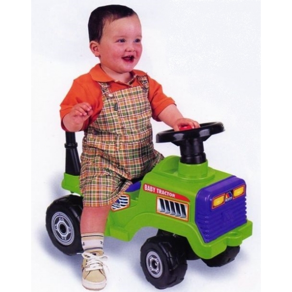 Машинка-каталка в виде трактора несмотря на легкомысленное название - это настоящий рабочий трактор. Своим внешним видом он похож на настоящий трактор, спереди у него капот с решеткой и фарами, а задние колёса больше передних.