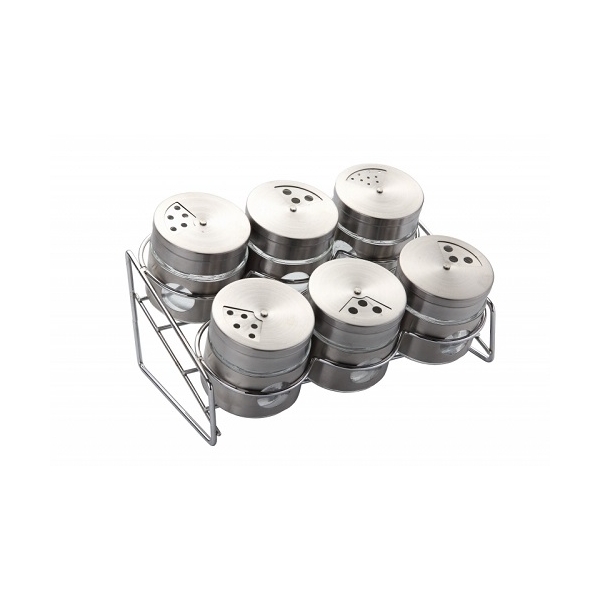 Удобный набор для специй из ударопрочного стекла и нержавеющей стали. Для удобства дозы в крышках всех емкостей имеются три вида отверстий.