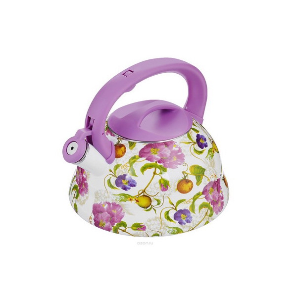 Чайник изготовлен из высококачественной нержавеющей стали с эмалированным покрытием. Корпус чайника оформлен ярким цветочным рисунком.