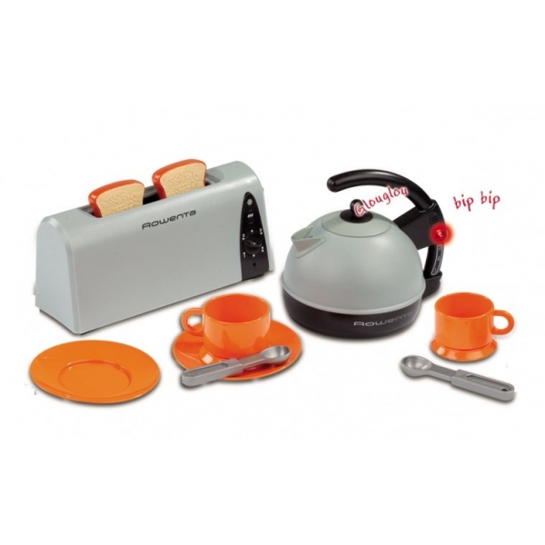 В наборе: две тарелки, две чашки, две ложки, тостер, электрический чайник, которые издают настоящие звуки.