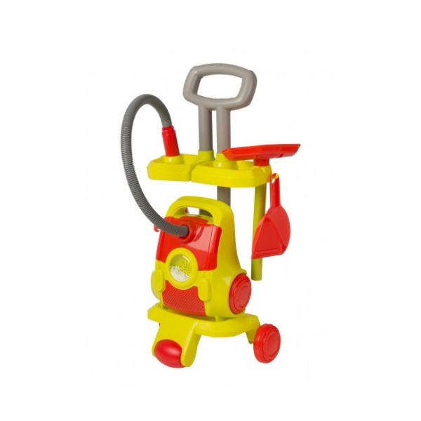 Пылесос со звуковыми эффектами. Внутри него находятся маленькие шарики. Во время работы они движутся, имитируя пыль. Столешница тележки оборудована крючками для совка и ручной щетки и разъемами для размещения шланга и щетки пылесоса.