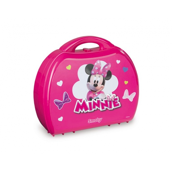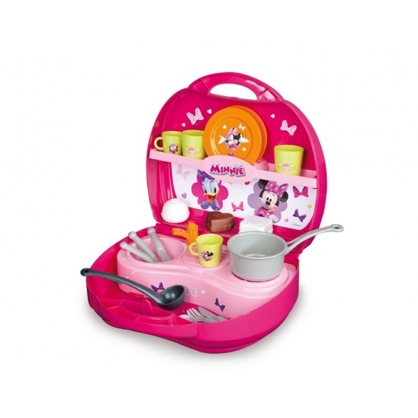 Детская мини кухня Smoby Минни Арт. №. 24066 помещается в чемоданчике с ручкой. На кухне имеются одноконфорочная плита, раковина с краном(без воды), сушилка для посуды, а также две полки–для продуктов и посуды. Кроме того, имеются кастрюля и половник. Так же в набор входят: 3 пирожных, 2 тарелки, 2 чашки, 2 вилки, 2 ножа и 2 ложки.
