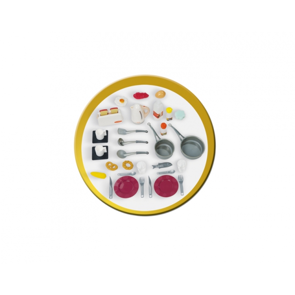 В набор входит 34 аксессуара: Тостер + 2 тоста, чайник, яичница, яйцо, кусок мяса, 2 баночки специй, кукуруза, 2 печеньки, рыба набор посуды на 2-х персон (вилки, ножи, ложни, тарелки, чашки, блюдца, стаканы), шумовка, половник, лопатка, губка и 2 сотейника.