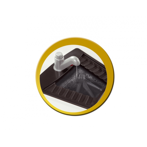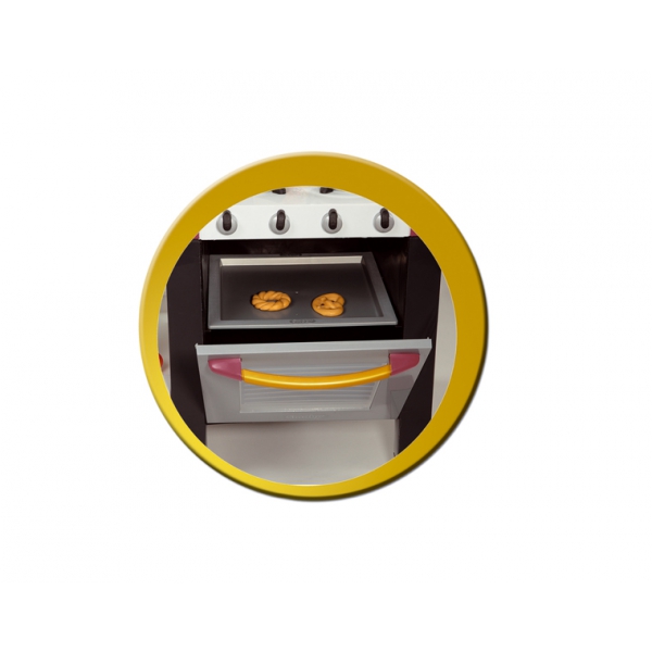 Такая игровая кухня станет прекрасным подарком вашим детям, ведь она даст им возможность на какое-то время стать немного взрослее. Большая, удобная, шикарная кухня - с ней одновременно могут играть несколько детей. Кухня включает съемный гриль-бар, электронную газовую плиту, холодильник, духовку, раковину и широкий вытяжной шкаф. Эта роскошная кухня обладает большой функциональностью и великолепным дизайном. Кухонный столик с ящиками, полочками и наполнением: 1. Плита и духовка; 2. Мойка (кран действующий - внутри конструкции циркулирует вода); 33 предмета, включая посуду, игрушечные продукты, готовые блюда и специи.