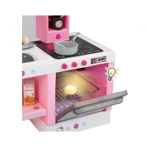 Кухня электронная miniTefal Cheftronic Hello Kitty это компактная кухня с многими электронными функциями. Благодаря своим эргономичным размерам, она нуждается в минимальном пространстве для размещения в детской. Все как в настоящей кухне - мойка с краном(без воды), духовой шкаф с подсветкой, варочная панель (звуки шипения и варения), кофеварка с реалистичными звуками, полочки для размещения продуктов - все это позволяет почувствовать себя настоящей хозяйкой на куне.