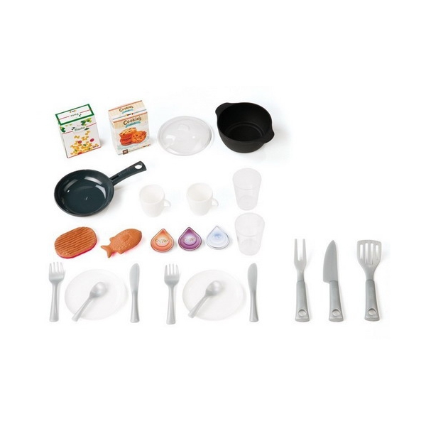 В комплект входит 25 аксессуаров: тарелка, нож, ложка, вилка, лопаточка, кастрюлька, чашка, стаканы, 2 коробочки и продукты питания.