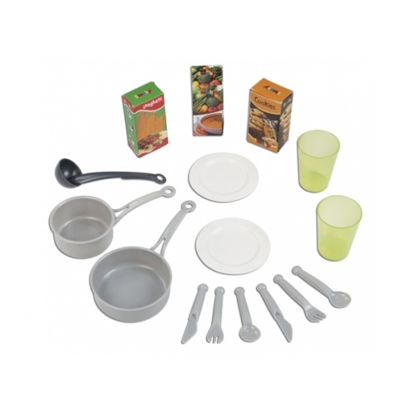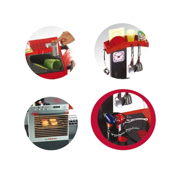 Детская кухня Smoby Tefal 24244 имеет оригинальную удобную форму для размещения в небольших помещениях, выдает звуки кипения и шипения. В духовке кухни можно зажечь освещение, также в ней открываются двери, в мойке предвиденная возможность подачи воды, а плита с 2-мя комфорками и с электроникой. В комплекте 19 игровых аксессуаров: стаканы, чашки, лопатка, половник и разные продукты, чтобы маленькие хозяева могли приготовить еду по вкусу.