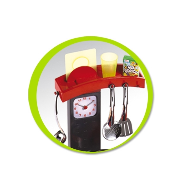 Кухня выглядит очень реалистично : правдоподобные звуковые эффекты: бульканье воды, шипение масла на сковороде, звук гриля. Духовка с подсветкой, особенно впечатляет звуковой сигнал, сообщающий об окончании приготовления блюда. Еще понравился приятный щелчок двери духовки. Несмотря на то, что кухня сделана из пластмассы, сломать ее достаточно трудно. Детали все сделаны надежно. Кнопочки все нажимаются и работают исправно. Конфорки подсвечиваются красным светом, сама плита имитирует стеклокерамику. В духовке есть решетка, на которую интересно ставить сковороду. Жаль, только, что нет звука льющейся из крана воды, но кнопка на кране нажимается. Наверху крючочки удобно использовать под полотенца или для посуды. Кухня хорошо разбирается взрослыми, ее удобно мыть. Легкая по весу, сбоку (возле раковины) есть ручка для переноски.