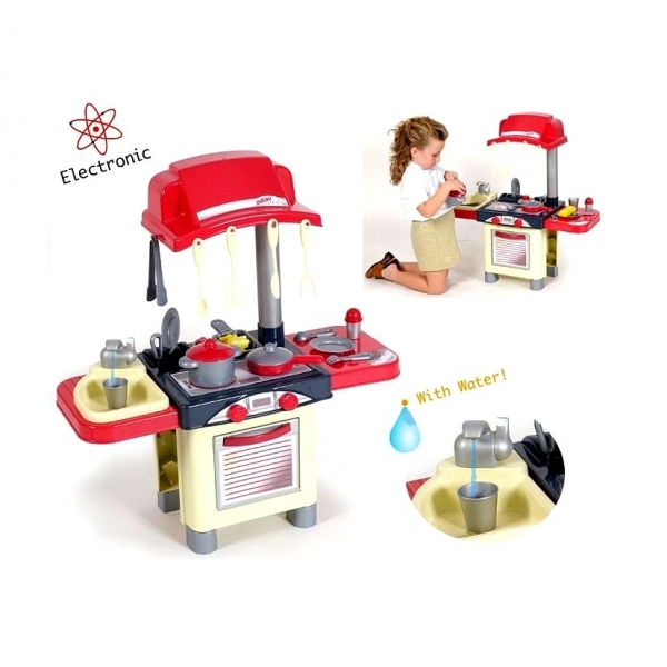 Оцените это сами!Компактная, яркая игровая кухня очень понравится Вашей маленькой хозяйке. Кухня и аксессуары сделаны из высококачественных пластиковых материалов. Игровые возможности кухни: -из крана течет вода,регулятор плиты поворачивается и издает щелкающие звуки -дверца духовки открывается Эта модель игровой звуковой кухни с водой очень удобна — здесь, помимо основного столика, где располагаются плита и сушилка для посуды, есть две навесные полочки, на одной из которых — раковина, а на другой — небольшой рабочий столик.