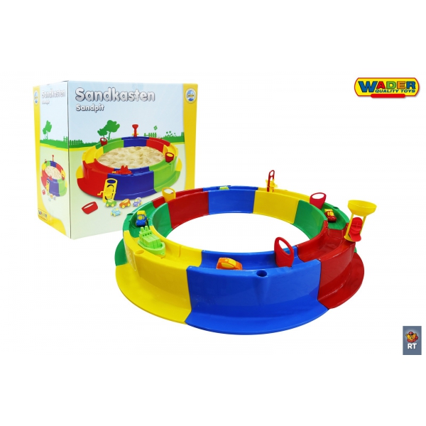 Во внутрь песочницы можно засыпать песок, а сверху по всему диаметру песочницы есть желоб,по которому можно пускать воду.