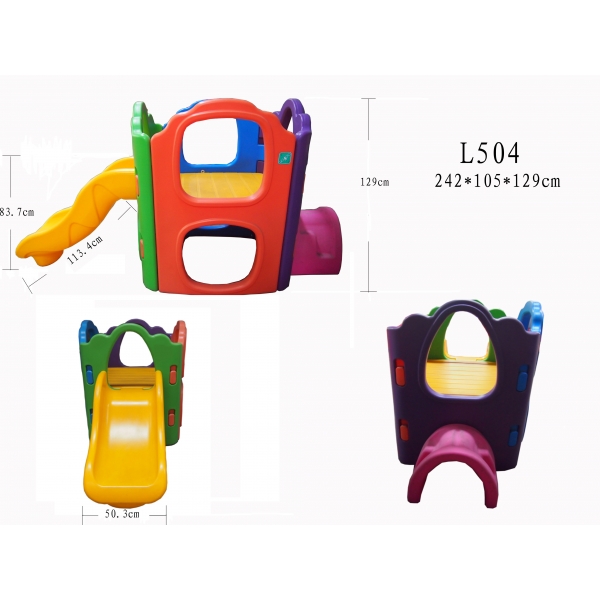 Комплекс Lerado L-504 представляет собой многофункциональный домик с множеством входов и выходов из него, лазоходами, через которые дети могут пробираться и активно играть друг с другом. Рядом есть небольшие ступеньки и горка для самых маленьких деток, которые могут с безопасностью для себя залезть и спуститься с нее. Волнообразная форма затормозит движение и дополнительно обезопасит детей при ускорении.