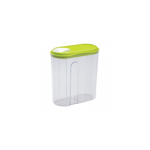 Емкость для сыпучих продуктов имеет овальную форму, специальные углубления позволяют комфортно удерживать емкость в руках. Возможна установка одной емкости на другую для рационального размещения на полке и в шкафу. Удобный дозатор позволяет высыпать содержимое, не снимая крышки. Три положения дозатора (закрыто, открыто, открыто «сито»).