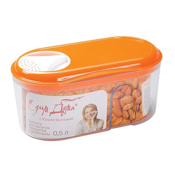 Емкость для сыпучих продуктов имеет овальную форму, специальные углубления позволяют комфортно удерживать емкость в руках. Возможна установка одной емкости на другую для рационального размещения на полке и в шкафу. Удобный дозатор позволяет высыпать содержимое, не снимая крышки. Три положения дозатора (закрыто, открыто, открыто «сито»).