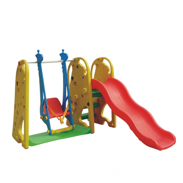 Детская горка Жираф снабженный качелями и волнистой горкой, и настоящим баскетбольным кольцом. Высокопрочный пластик, из которого изготовлен корпуск комплекса, позволит ему радовать много хозяина очень долгий срок. Окрепший малыш, начиная с двух лет, сможет начать заниматься спортом и развлекаться со своим другом на комлексе Жираф и научиться новым физическим навыкам и совместным играм с друзьями. В этом комплексе смогут играть сразу несколько детишек – кто-то летает с горки, кто-то катается на качелях, а самые ловкие смогут играть в баскетбол.