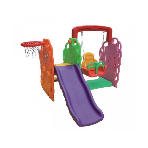 Игровой комплекс состоит из горки, качелей и баскетбольного кольца.