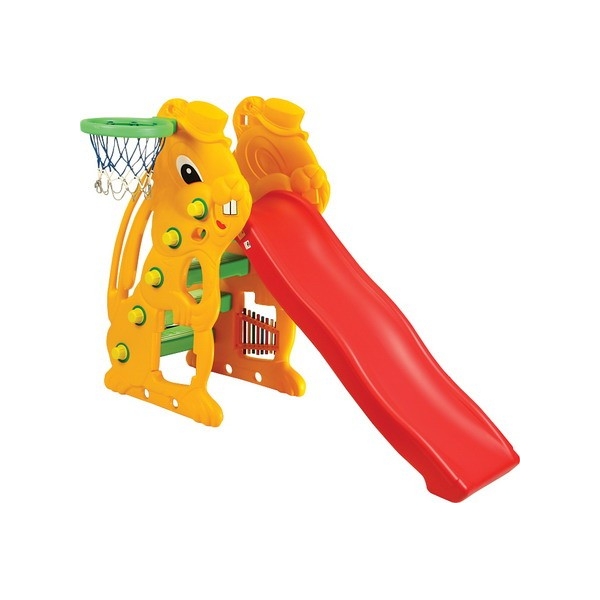 Детская горка пластиковая Заяц оборудована баскетбольным кольцом.