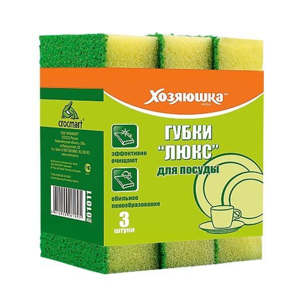 Губка для посуды "ХОЗЯЮШКА Мила" ЛЮКС, 3 шт. Поролоновые губки "ЛЮКС" отличаются от большинства губок тем, что вместо абразивного чистящего слоя используется слой с эластомерной активной поверхностью (эластомер имеет полиуретановую основу). В отличие от абразивной фибры эластомер не наклеивается, а накатывается на поролон, поэтому срок службы такой губки во много раз дольше, чем обычной губки.