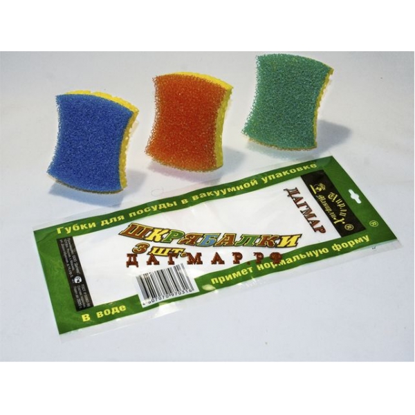 Набор из 3 губок для мытья посуды в вакуумной упаковке. Губка для посуды Шкрябалки. Вакуумная упаковка губок позволяет уменьшить их объём в пять раз, за счёт чего производитель экономит денежные средства при транспортировке и хранении готовой продукции, таким образом, делая её более доступной для покупателя. В воде губки примут нормальную форму. Состав: поролон.