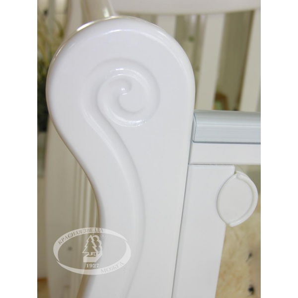 Для того, чтобы опустить боковое ограждение нужно одновременно отжать ручки с обеих сторон ограждения. Поднятие и фиксирование осуществляется одной рукой. С помощью данного устройства (ЗПУ-7) можно без лишних усилий убрать ограждение и приставить детскую кроватку рядом с кроватью мамы. В данной модели кровати установлены 2 подпружиненные стойки, которые можно легко убрать, чтобы ребенок мог самостоятельно укладываться спать. Сняв боковое ограждение, кроватка с легкостью превращается в изящный детский диванчик.