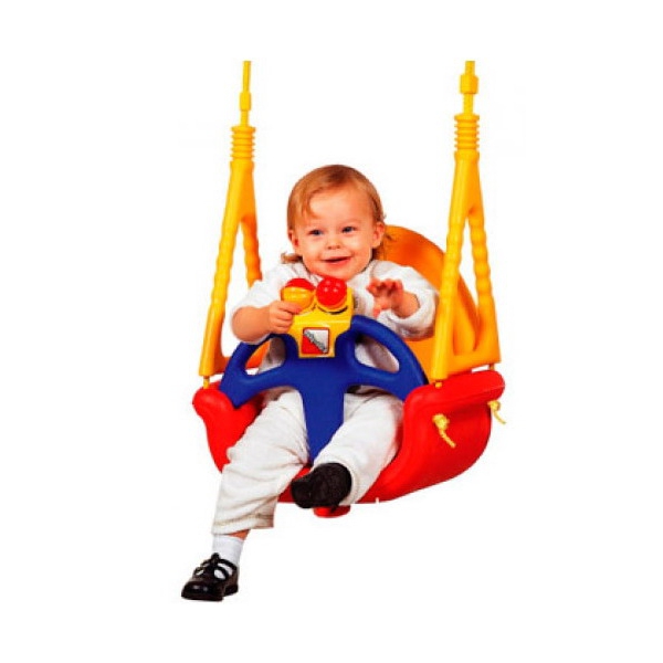 * Качели трансформируются в зависимости от возраста ребенка. Первоначальное положение, когда ребенок еще мал, качели крепятся с передней панелью и с задней спинкой, чтобы малыш не упал, с музыкальной панелью для веселого качания.