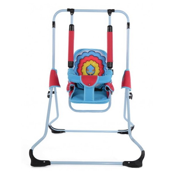 Это красочные качели с интересной аппликацией в виде павлина. Качели имеют комфортное и мягкое сиденье, съемный держатель перед ребенком, ремень безопасности, мягкие ручки.