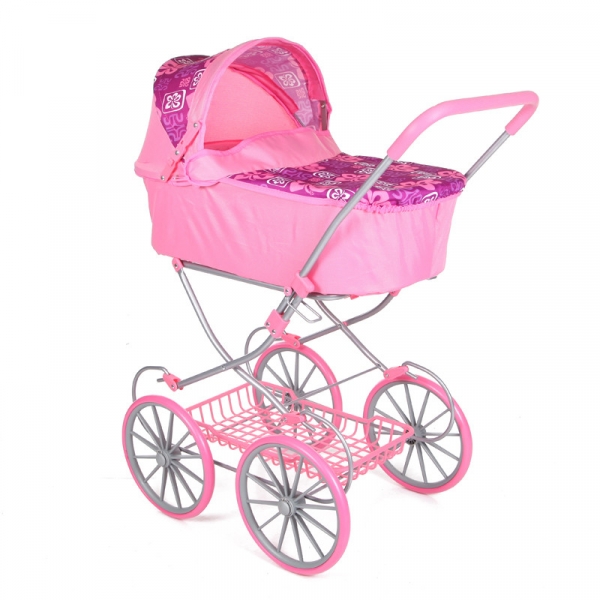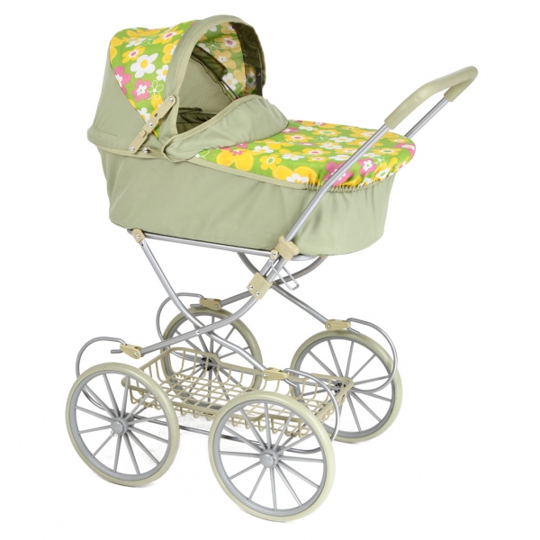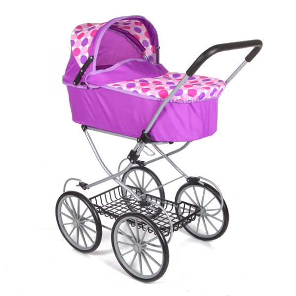 Одна из самых высокий моделей. Коляска выполнена в классическом стиле, с большой корзиной-люлькой, капюшоном, корзиной для мелких кукольных вещей, как у настоящей коляски.