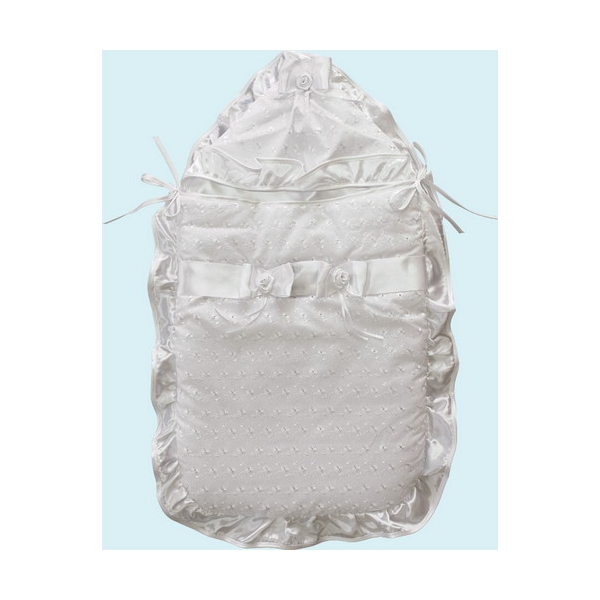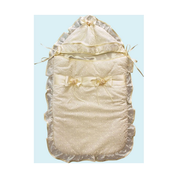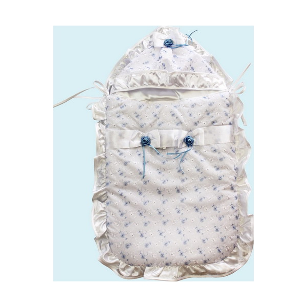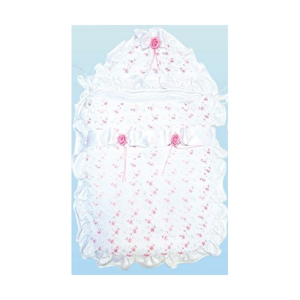 Конверт на выписку крохи из роддома нежного дизайна. Украшен маленькими красивыми розочками, рюшами по краю и ленточками.