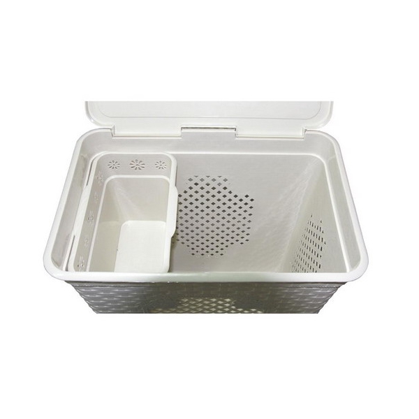 Корзина имеет удобно открывающуюся крышку, есть вставка для хранения мелких вещей. У корзины имеются отверстия для циркуляции воздуха. Хорошая циркуляция воздуха внутри корзины для грязного белья является немаловажным условием.