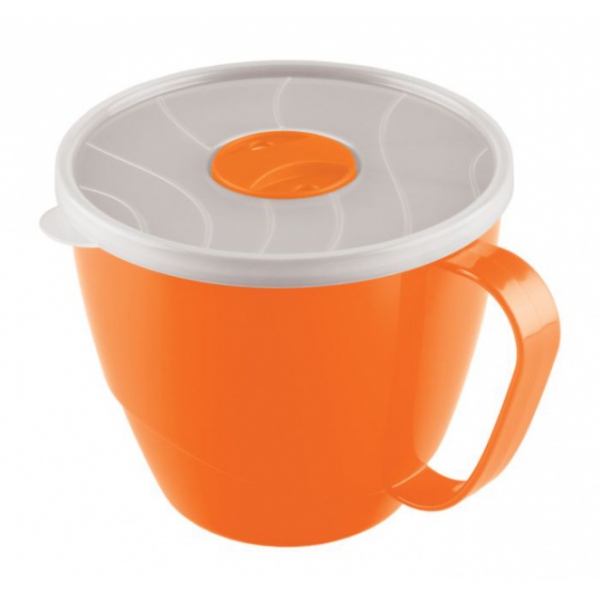 Компактный и в то же время вместительный контейнер-кружка подходит для супов, бульонов и напитков. Крышка позволяет сохранять содержимое горячим. Благодаря клапану можно разогревать содержимое в микроволновой печи, не снимая крышки (при открытом клапане).