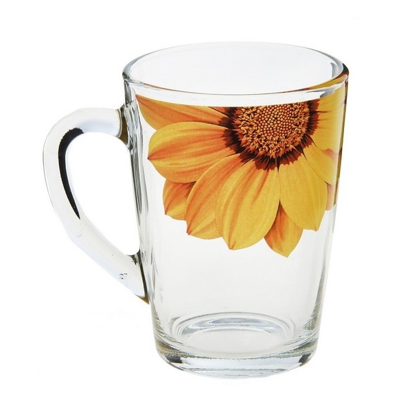 Кружка изготовлена из бесцветного стекла и украшена ярким рисунком. Идеально подходит для сервировки стола.