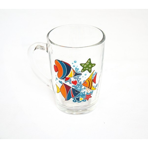 Кружка изготовлена из бесцветного стекла и украшена ярким рисунком. Идеально подходит для сервировки стола.