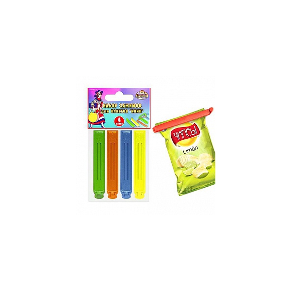 Набор зажимов Клип. Количество 4 шт. Длина 11 см. Зажимы для пакетов - это очень полезная в хозяйстве штучка. Для разных пакетов предусмотрены свои зажимы разной длинны. А еще они разноцветные такие и удобные и легкие в использовании. Любой пакетик, с приправой или крупой, порошком или молоком теперь надежно закрыт. Ничего не высыпется и не вытечет.И в пакетик не попадет то, что не должно туда попасть.