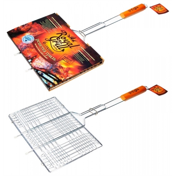 Решетка-гриль средняя 6 секций 31х24см RoyalGrill из высококачественной стали. На решетке удобно размещать стейки, ребрышки, гамбургеры, сосиски, рыбу, овощи. Блюда получаются сочными, ароматными, с аппетитной специфической корочкой. Рукоятка изделия оснащена деревянной вставкой и фиксирующей скобой, которая зажимает створки решетки.