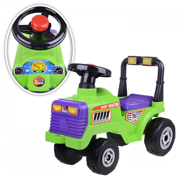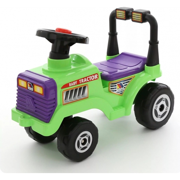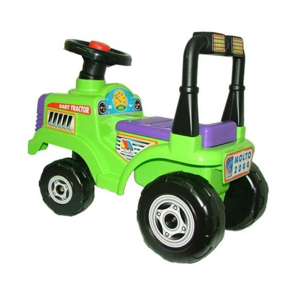Машинка-каталка в виде трактора несмотря на легкомысленное название - это настоящий рабочий трактор. Своим внешним видом он похож на настоящий трактор, спереди у него капот с решеткой и фарами, а задние колёса больше передних.