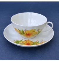 Чашка чайная с блюдцем Белый лебедь Желтая лилия 275 мл. Чайные пары из фарфора – классика столовой сервировки. Несмотря на изобилие производственных материалов, посуда из фарфора не теряет своей популярности. Это объясняется высокими прочностными характеристиками и экологичностью. Фарфоровые чашки ничего не впитывают и не выделяют, полностью соответствуя международным санитарным нормам. Материал отличается низкой теплоотдачей и равномерным прогревом. Благодаря этому напиток медленно остывает. Изящные сосуды сохраняют первоначальный внешний вид в течение долгих лет.