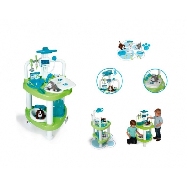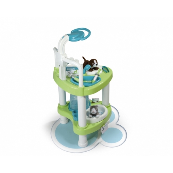 В комплект входят 2 пациента миниклиники: песик и котик, каждый со своей медицинской карточкой, миска для еды и воды, термометр, шприц, молоточек для проверки рефлексов, стетоскоп с полоской электронной диагностики работы сердца, хирургический зажим, 2 коробочки для таблеток и другие медицинские принадлежности. Для каждого пациента предусмотрено свое индивидуальное место. В миниклинике Smoby есть душ, а еще верхний этаж оборудован имитацией большой операционной лампы. Так что, дел у маленького ветеринара будет невпроворот. Малыш очень обрадуется такому увлекательному и многофункциональному подарку.