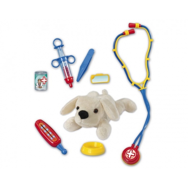В набор входит: игрушечная собачка, будка, набор инструментов ветеринара (мисочка, стетоскоп, шприц, градусник)