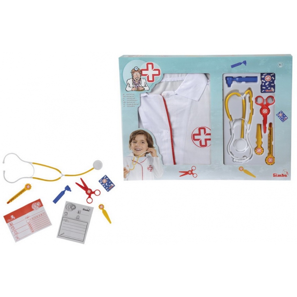 Это набор игровой для доктора с 8 предметами и белым халатом.