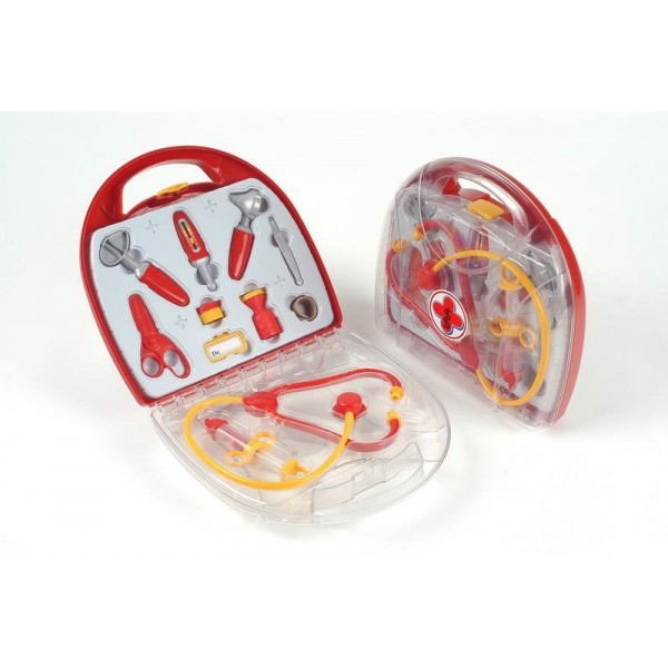 В наборе множество аксессуаров для игры в доктора: медицинский молоточек, пинцет, стетоскоп-наушники, шприц, ножницы,пластмассовый жгут, баночки для мазей, табличка доктора.