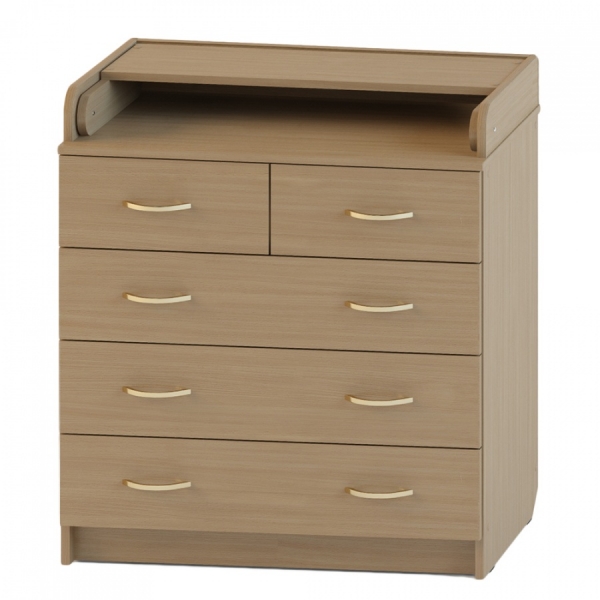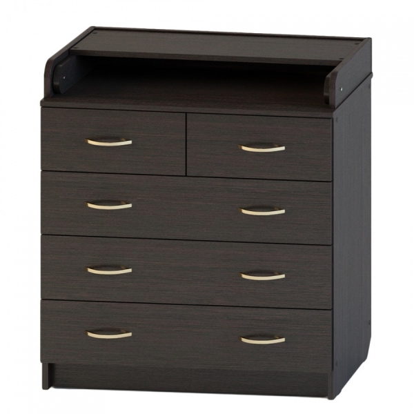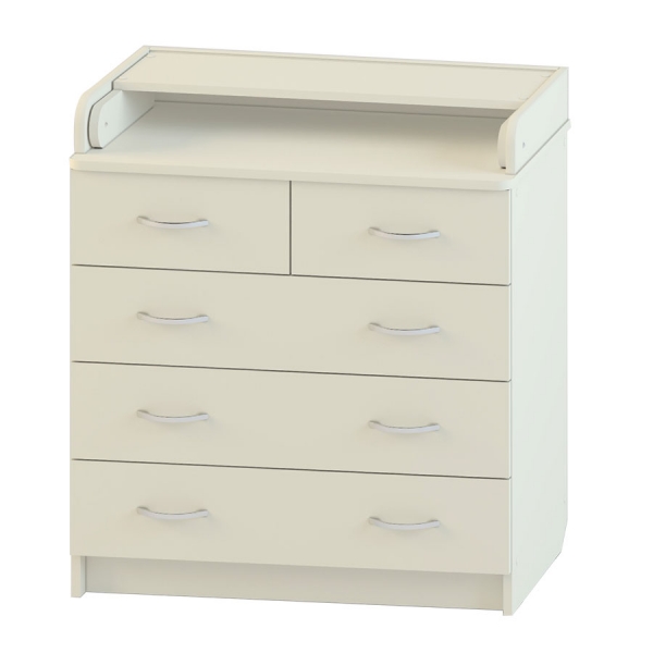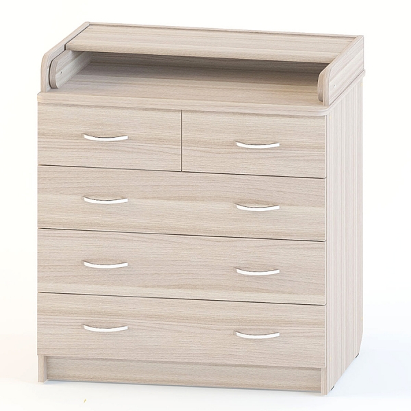 Пеленальный комод оснащен пятью вместительными ящиками.