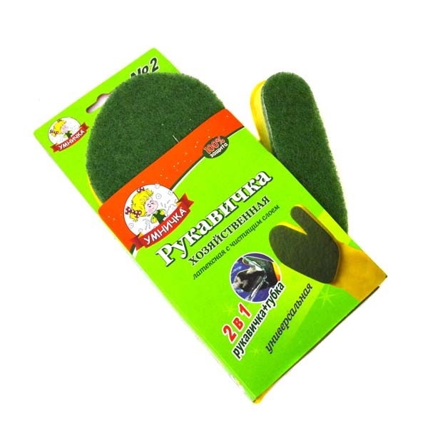 Рукавичка латексная "Умничка" с чистящим слоем № 2 (для повседневной чистки) изготовлена из натурального латекса, на ладони расположена губка с верхним слоем из фиброабразива. По сравнению с обычной перчаткой и губкой, руки защищены и одновременно есть возможность чистить загрязнённые поверхности. Губка с абразивом имеет больше площадь очистки поверхности в отличие от обычной губки. Рукавичка оснащена специальным удлинённым манжетам, что позволит воде не проникнуть внутрь.