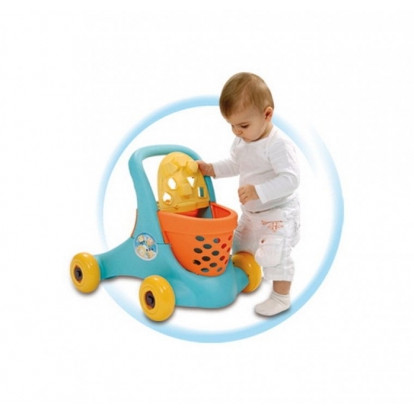 Первые шаги вашего ребенка будут увереннее, если малыш будет учиться передвигаться с помощью игровой тележки Smoby. Сначала ребенок может подниматься, держась за тележку, колеса которой заблокированы. Позже можно снять блокировку, и малыш будет шагать вперед, толкая яркую тележку перед собой. Чтобы самостоятельная прогулка была более веселой, на крышке тележки установлены фигурки персонажей Cotoons. Сама же тележка к тому же является сортировщиком, то есть имеет прорези разных геометрических форм, через которые малыш может закидывать фигурки внутрь тележки. Персонаж Cotoons переместится в корзину только в том случае, если ребенок выберет фигурку с основанием нужной геометрической формы. Кроме того, во вместительную корзинку тележки можно сложить любимые игрушки и взять их с собой на прогулку.
