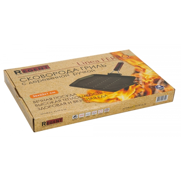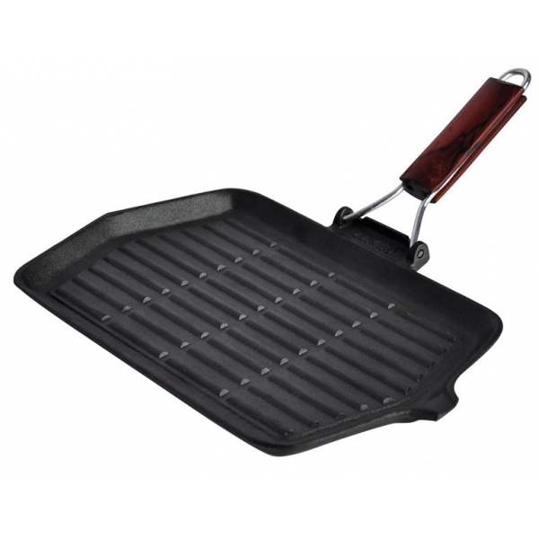 Сковорода гриль линии FERRO. Оснащена деревянной складывающейся ручкой для удобства хранения. Оригинальная прямоугольная форма позволяет одновременно готовить больше продуктов, чем в традиционной круглой сковороде.