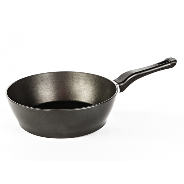 Сковорода универсальная Надежда литая алюминиевая с пластиковой несъемной ручкой, утолщенным дном и антипригарным покрытием.
