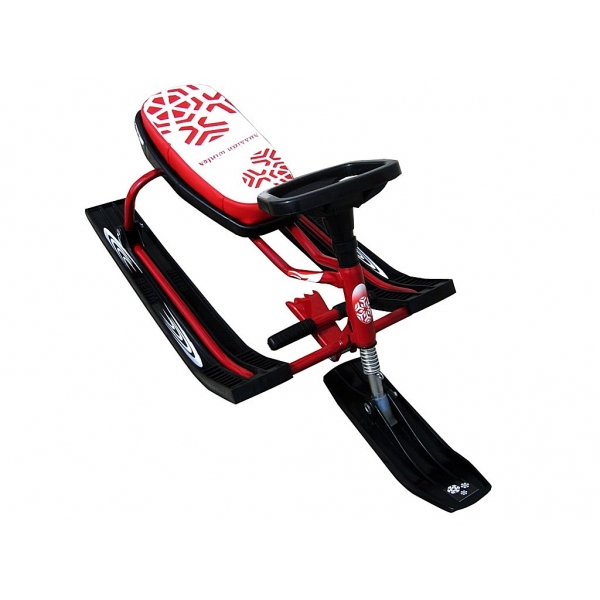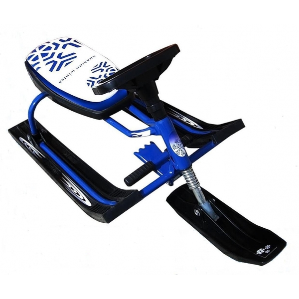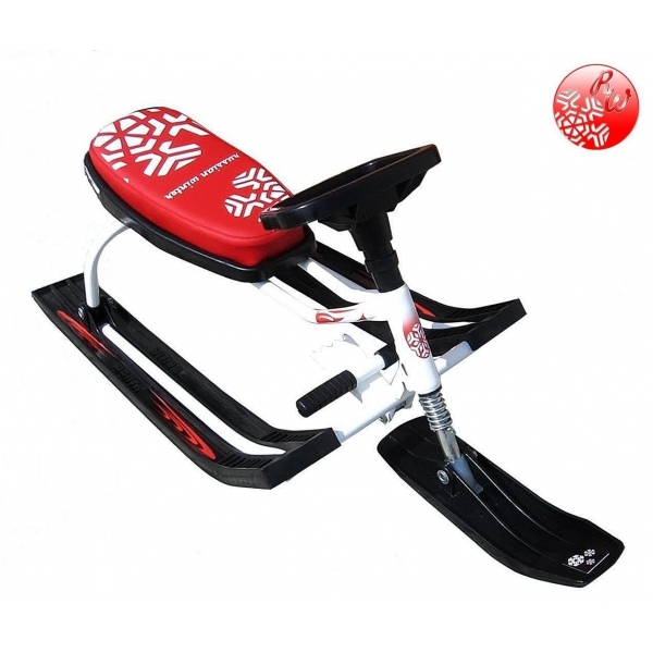 Руль снегоката похож на штурвал самолета, это существенно повышает маневренность при спусках. Пружинный амортизатор, расположенный на рулевом механизме передней лыжни снегоката, позволяет без проблем преодолевать ямы и кочки, а уникальный ножной тормоз в виде двух пластин из металла с острыми зубьями дает возможность резко тормозить снегокат в опасных ситуациях, без малейших неприятных последствий и без разворота.